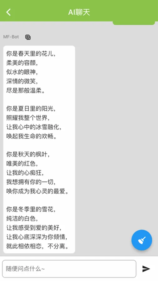 MF-Bot是一款跨平台的AI智能聊天机器人,支持AI聊天、AI绘画(规划中)、AI交友(规划中)等功能。