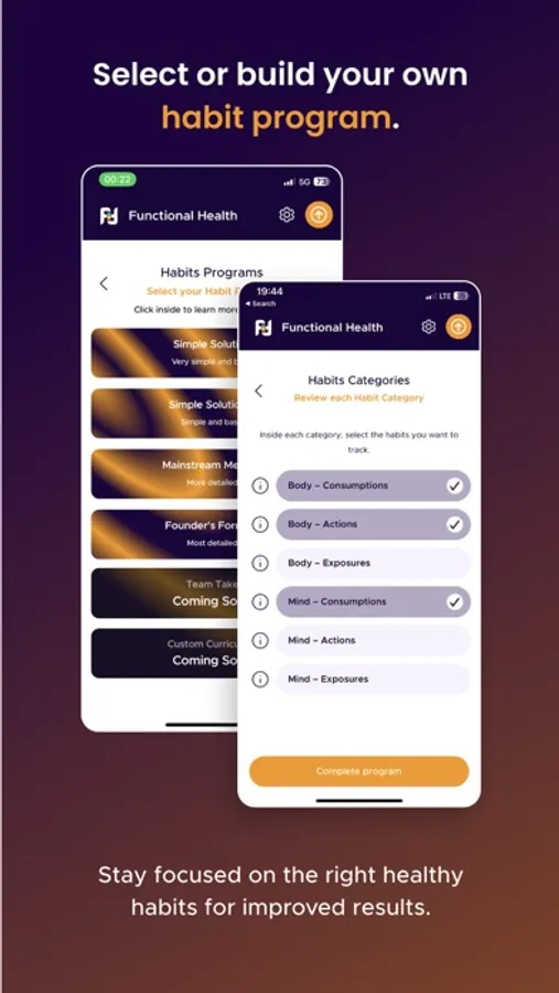The app lets you select or build our own habit program; you can select from a number of preconfigured habits programs (of varying detail and content) and adjust to your specific needs. The habit programs keep you focused on the right healthy habits for improved results.