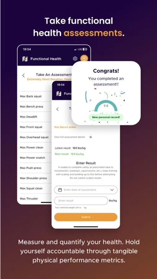 You can also use the app to take functional health assessments – physical fitness measurements, essentially. This will measure and quantify your functional health. These assessments are numerous and spread across a range of time, modality, and loading. Everything from a heavy deadlift to a 10 km run (and lots of others in-between). The assessments in the app will also hold you accountable secondarily to your daily habits through tangible physical performance check-ins.