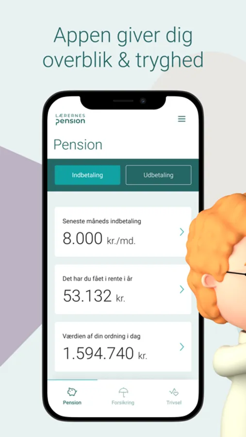 meget andet. Når du har en ordning i Lærernes Pension, gør appen det enkelt for dig at følge med i, hvad du kan regne med at få udbetalt, hvad du får i rente og om du får sparet nok op i forhold til vores anbefaling.