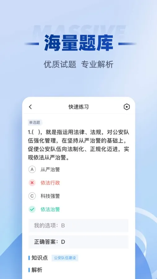 招警考试题库内含考点练习,全国通用卷以及地区卷模拟练习,以及按照固定考试比重的随机式的抽题的真题考场,成绩单实时记录考试数据,一点一滴的反馈考生近期学习状态以及自我正确率的提升,大大的给予考生通过考试的信心。