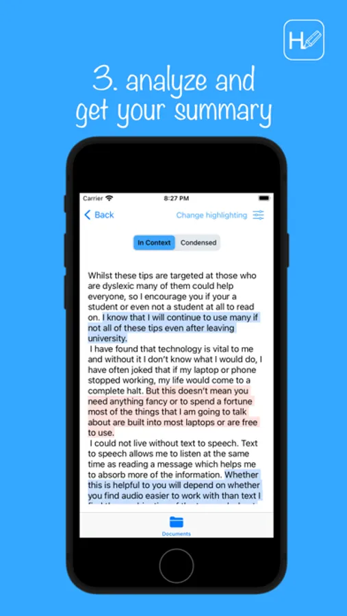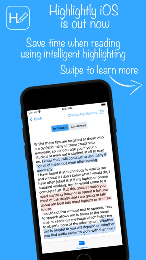 Highlightly takes a new approach to supporting reading instead of rewording a text or providing a brief summary, we highlight key sentences in context so you can cut down on the waffle and read only what is important. We even have a condensed mode that lets you see just the highlighted sentences which is perfect for use with the iOS screen reader and retaining the authors’ real sentences.