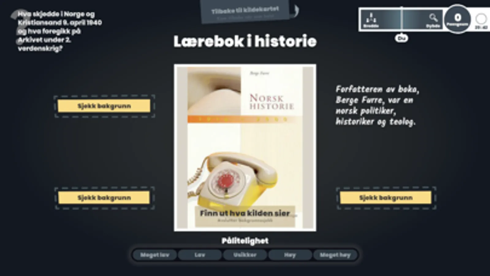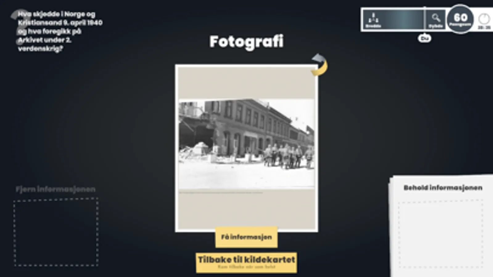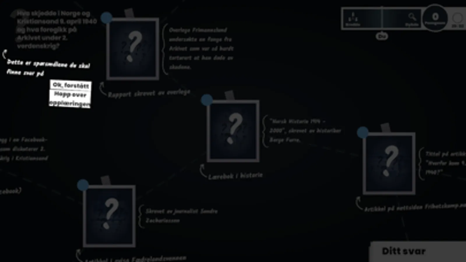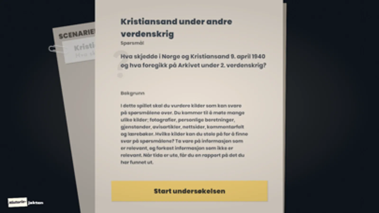I dette spillet skal du vurdere kilder som forteller om hva som skjedde på ARKIVET og i Kristiansand under 2. verdenskrig. Du kommer til å møte mange ulike kilder; fotografier, personlige beretninger, gjenstander, avisartikler, nettsider, kommentarfelt og lærebøker. Hvilke kilder kan du stole på for å finne svar på spørsmålene?
