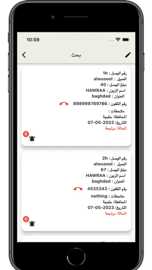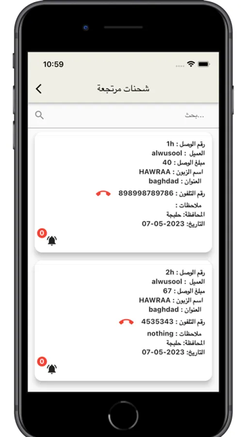 واجهة عرض طلبات التوصيل واجراء التسليم والارجاع