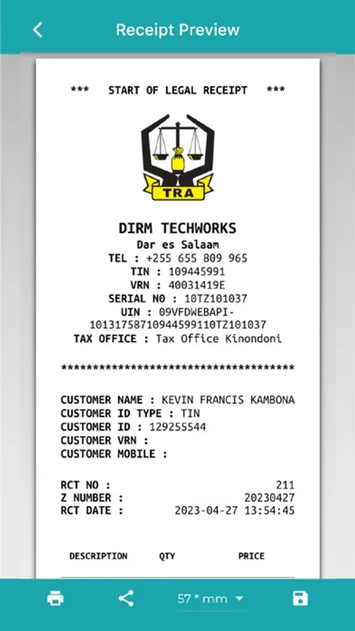 DirmVFD is application which allow People/General Public and Businesses to issue & Print Receipts & Invoices which are Approved & Recognized by Tanzania Revenue Authority (TRA). Just download the App & Signup and issue your Receipts & Invoices