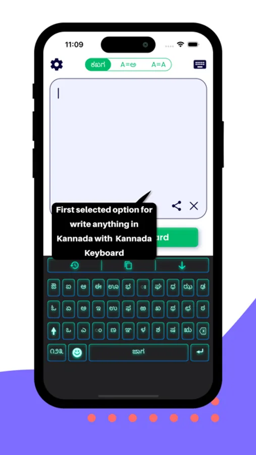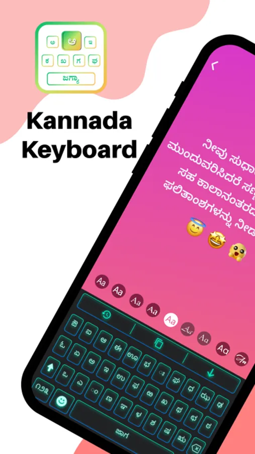 Easy and fast Kannada typing is the first priority of this Kannada Keyboard. Besides direct Kannada typing pad, it also supports phonetic avro style typing. This keyboard helps you typing Kannada very fast with Kannada letters with A = Kannada Key .