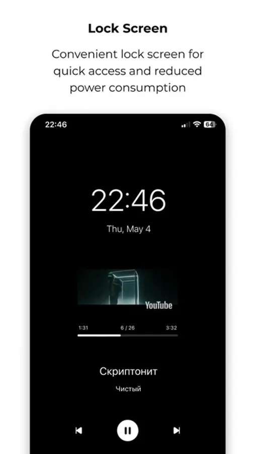 Lock screen. Convenient lock screen for quick access to playback control and reduced power consumption