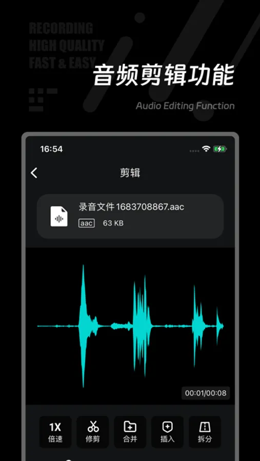 录音机,一款操作简单,快捷的录音制作APP。内容丰富多样,可随时导入音频文件,录制专属声音,并可对音频文件进行剪辑,合并,倍速调整,插入操作。