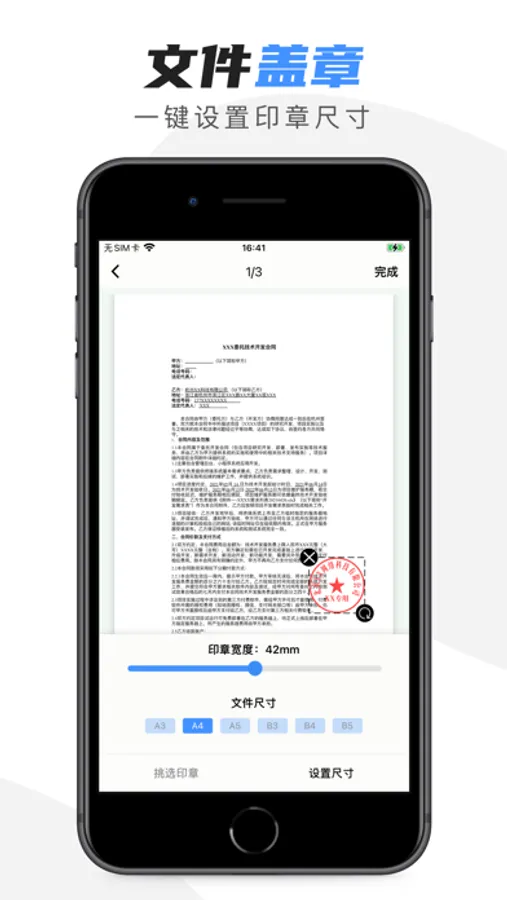· 文件一键盖章,支持导入文档,根据文档尺寸调节印章大小,一键盖章