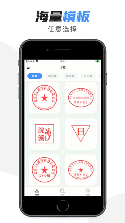 手机上的印章制作神器,内含各种印章模板,样式丰富多样,包括圆形印章,方形印章,椭圆印章等。