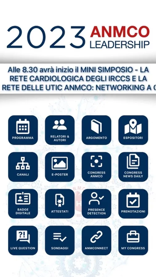 Applicazione ufficiale del 54° Congresso ANMCO 2023, in programma dal 18 al 20 maggio a Rimini, per la fruizione di tutti i servizi offerti al Congresso.