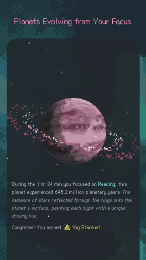 Short-term Incentives: After each focus session, the planet’s landscape changes and tells you its story.