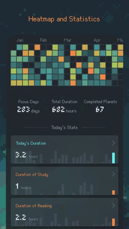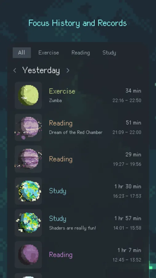 Each project corresponds to a planet. You can track different categories of focus time with projects and quickly switch between projects on the home screen by swiping left or right.