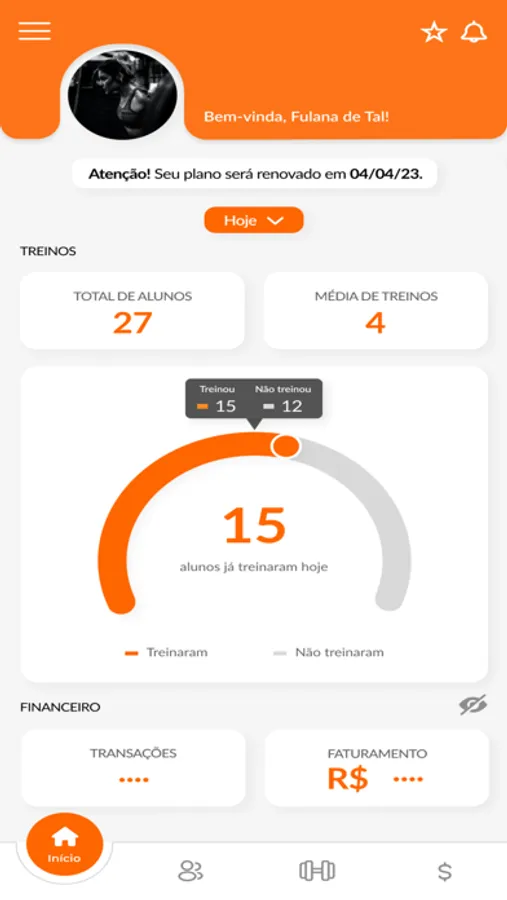 Estatísticas em Tempo Real: Acesse detalhes sobre o desempenho dos seus alunos, como a quantidade de treinos realizados no dia e na semana, informações financeiras como vendas realizadas e valores a receber.