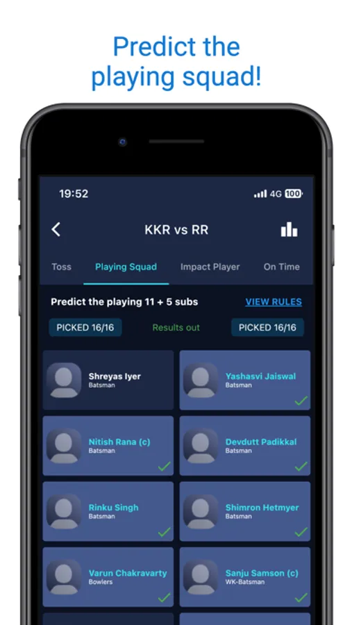 - Predictions: Users can predict the outcomes of various events during a cricket match, such as the toss winner, playing squad, match winner, impact player, and super over.