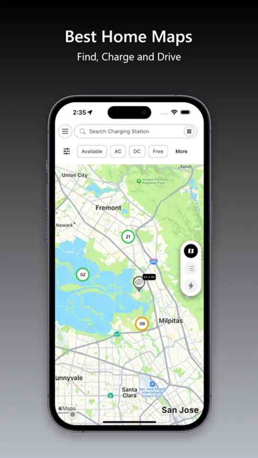 - Default Map with site cluster and with port status: The map view displays charging ports as clusters, making it easier to find the nearest one.