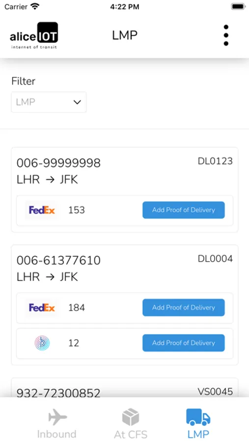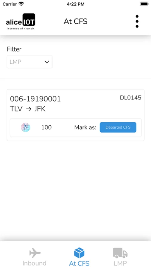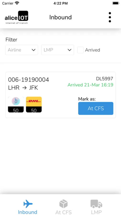 Alice IOT Mobile Application - CFS Module1. This application is part of the Alice IOT virtual eCommerce global transit connectivity suite and is fully integrated with Alice IOT. It is designed to optimise the processes around airline recovery, freight shed movements, parcel handling, staging and delivery to last mile provider for injection. The application shows a live feed of inbound movements based on the user’s gateway airport and enables direct capture of shipment progress and supporting documentation with automatic updates to the Alice IOT platform giving real time access to all users with appropriate access rights.