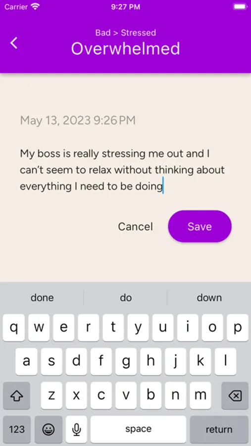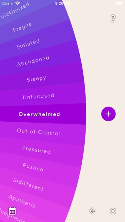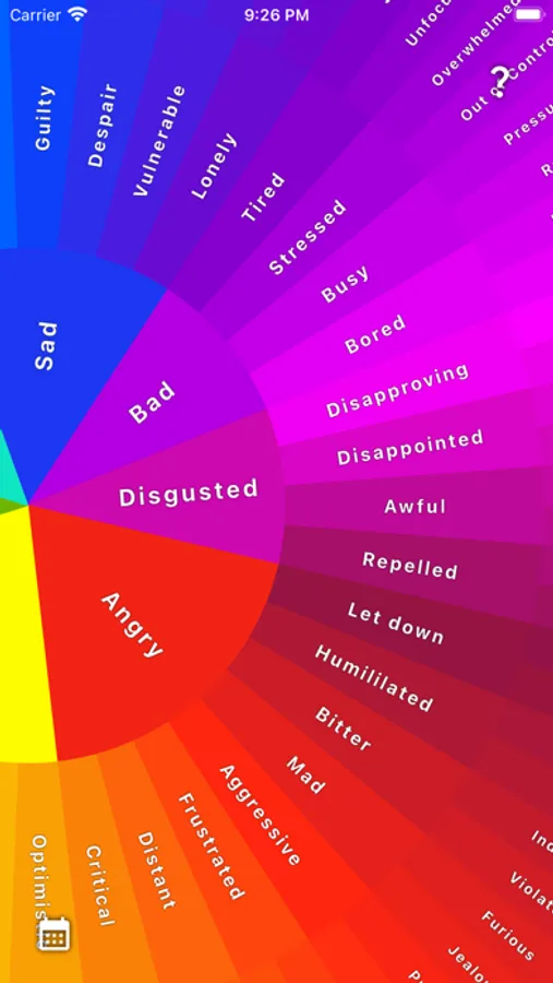 Wheel of Feels is a tool to help you identify and express your feelings. We are always feeling something, but sometimes we don't know what we are feeling. At any point in time, you can come to the wheel and check in with yourself. Identify how you are feeling by starting in the middle of the wheel. Make your way to the outside of the wheel by tapping on the feelings that resonate with how you currently feel. Once you've made it to the outside edge of the wheel, you can add an entry to your feelings journal and track and analyze your feelings over time.