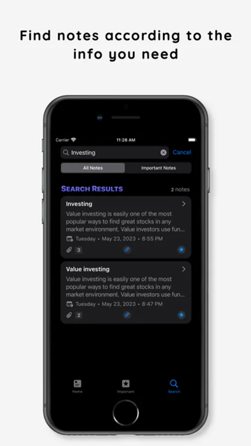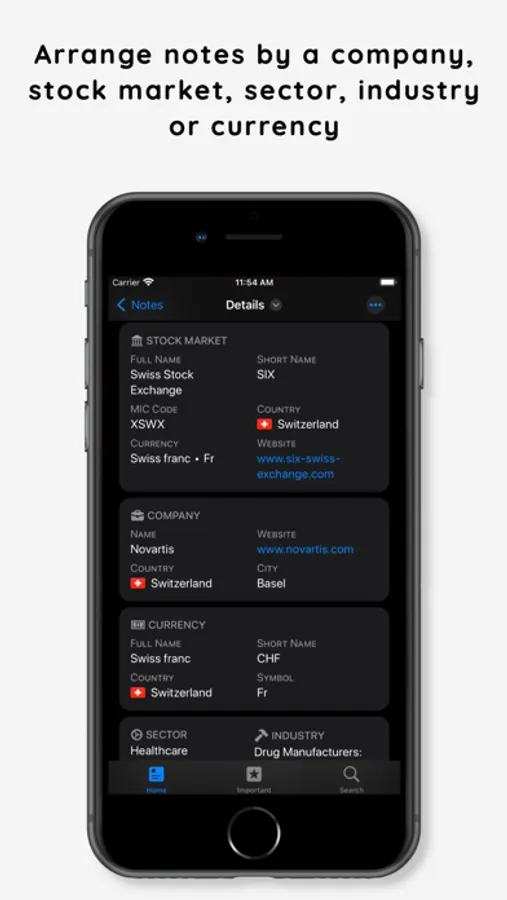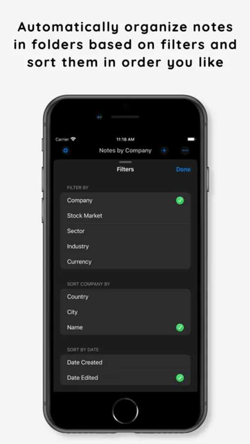 Automatically organize notes in folders based on filters. Arrange notes by a company, stock market, sector, industry or currency.