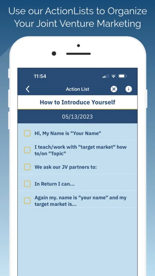 This app is designed to teach you the importance and value of finding Joint Venture partners for your business and how to go about connecting with, crafting a deal, and following through on that collaboration. We teach you why Joint Ventures are important to any business and how to craft your own approach to people who will be ideal JV partners for you.