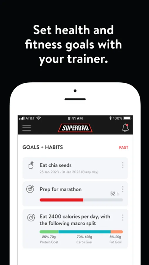 Tu pourras suivre et enregistrer ton plan d'entraînement, recevoir des directives nutritionnelles, mettre en place de nouvelles habitudes de vie et avoir une manière de voir ta progression, tout ça grâce à l'Appli du SuperDad You can follow & track your workouts, your nutrition, your lifestyle habits, measurements and results–all with the help of your coach.