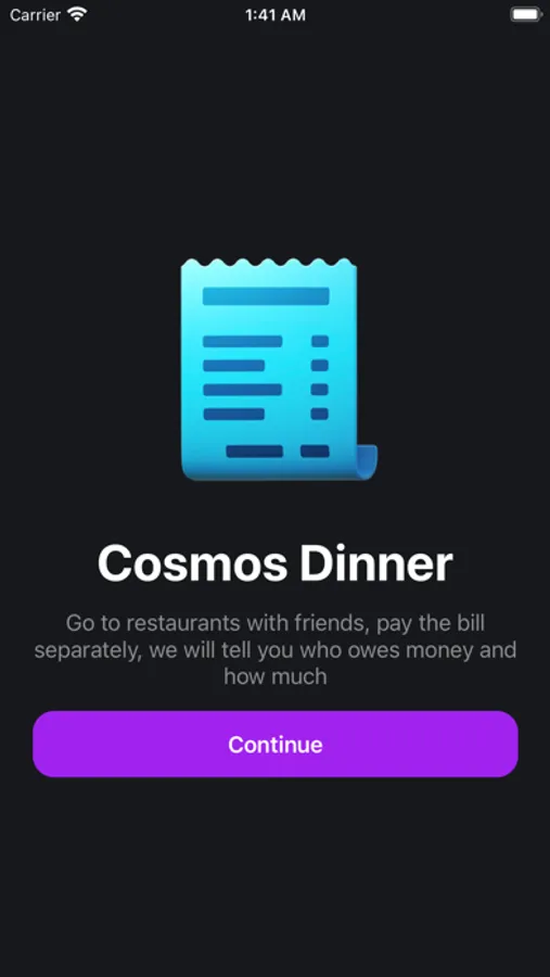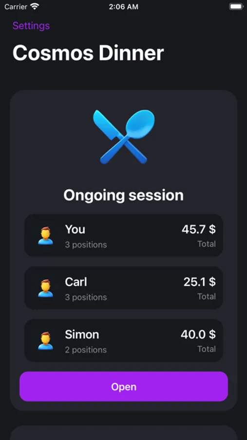 With Cosmos Dinner you will be able to pay money directly during dinner. Just click the "Start tracking" button, add people and that's it, dinner has begun and you won't have to remember at the end who ordered what.