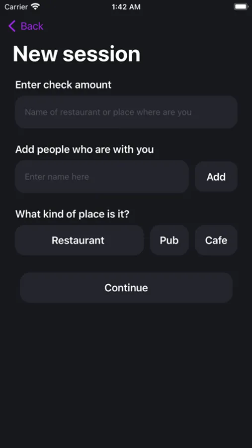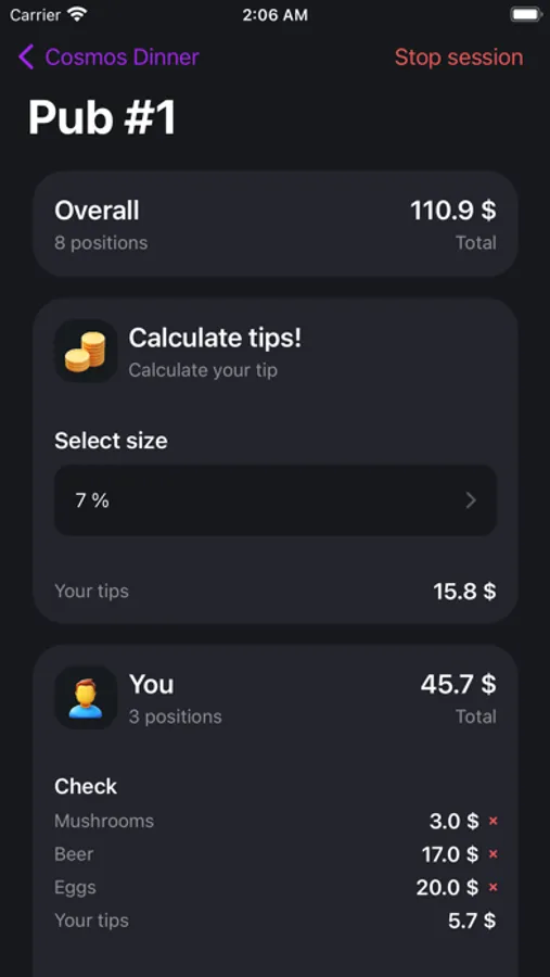 Add items from the menu for a specific person and indicate their cost. The app will keep separate checks for each of your friends, as well as display how much you will have to pay for dinner in general. You will see not only the cost, but also how many items from the menu each of you ordered.