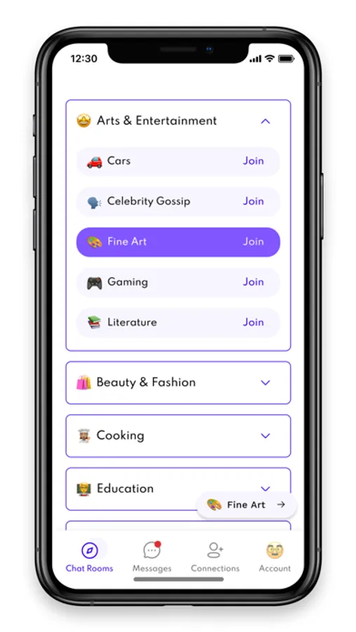 - Explore in real time the many categories of rooms to choose from such as Entertainment, Romance, Opinions Support and more.