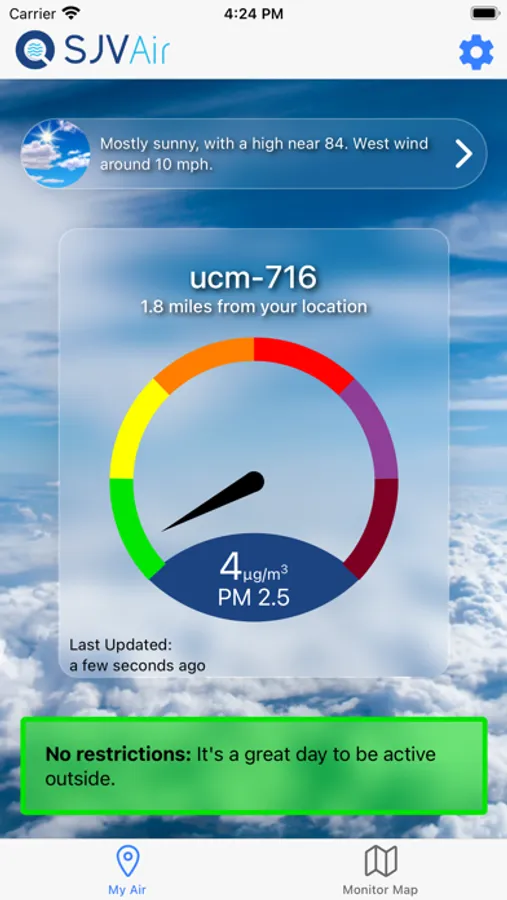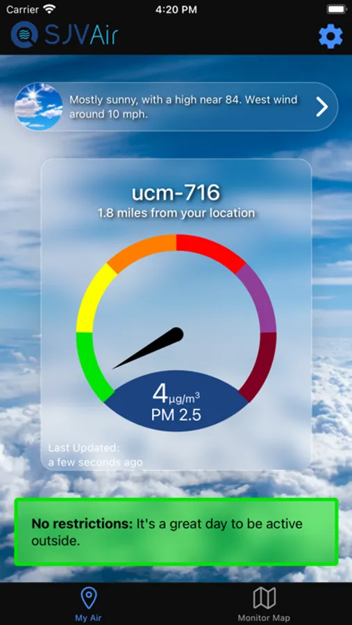 Keep any eye on your local air quality and receive outdoor activity guidelines based on hourly fine particle pollution (PM2.5) concentration. Going out for the day? Enable "Auto Update" in the app's settings menu and get live notifications when you enter hazardous air!
