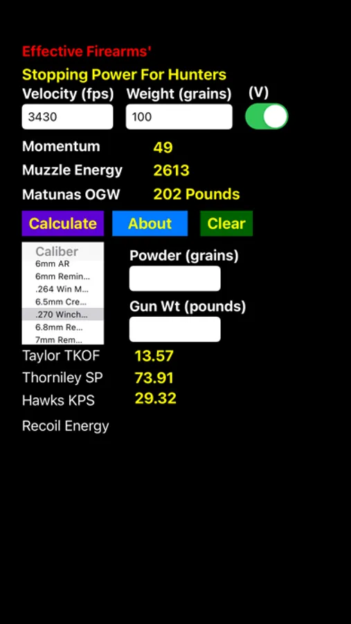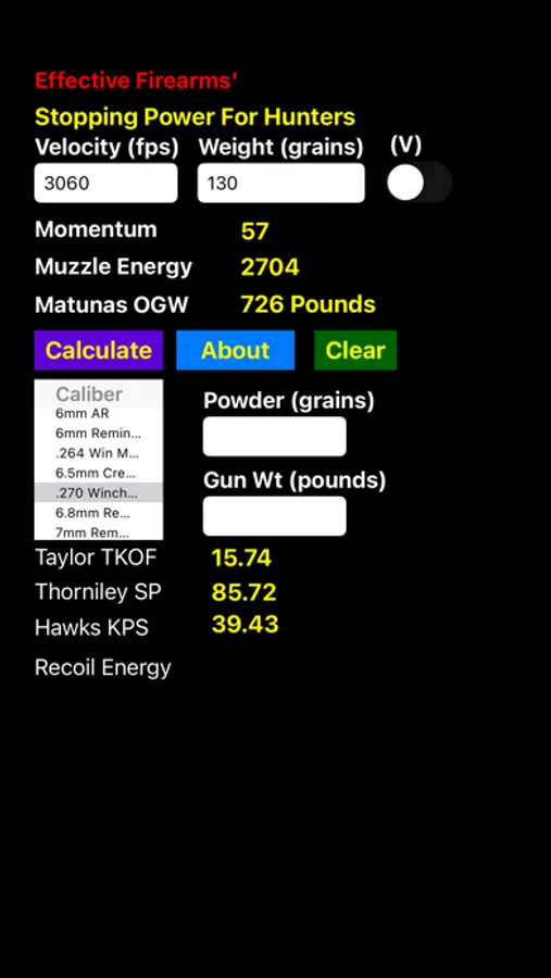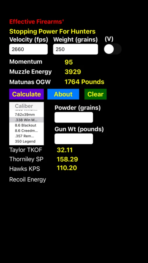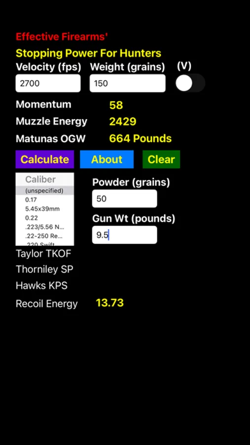 Enter the caliber and you can also display the Taylor Knock Out Factor (TKOF), the Thorniley Stopping Power (SP), and the Hawks Killing Power Score (KPS).