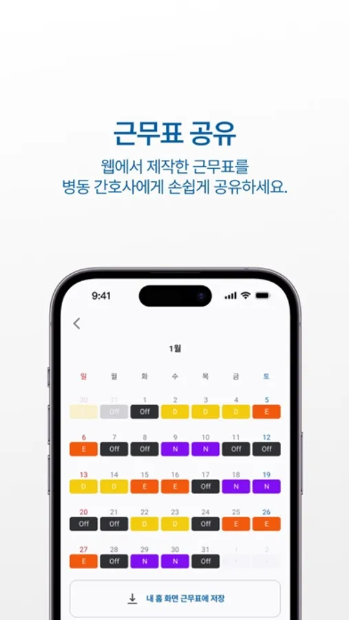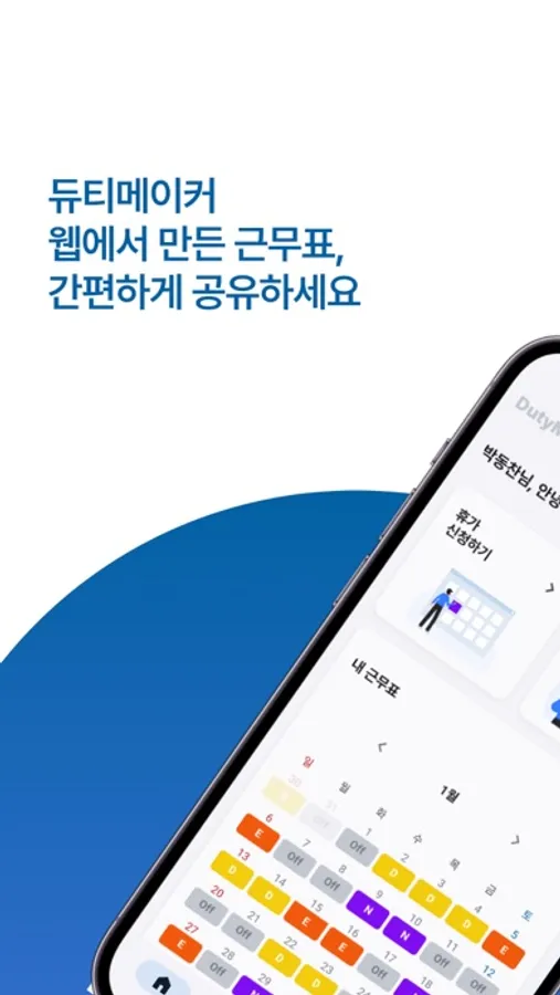 인터넷에서 dutymaker.com에 접속하면, 3분만에 한 달 근무표를 만들 수 있어요. 이 앱으로 dutymaker.com에서 만든 근무표를 공유하고, 편리하게 수간호사에게 휴가를 신청할 수 있어요.