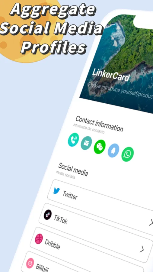 One link, share all your social media profiles. Aggregate all your entry points, social accounts, website content;