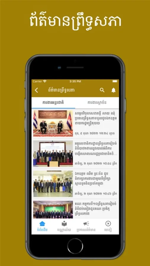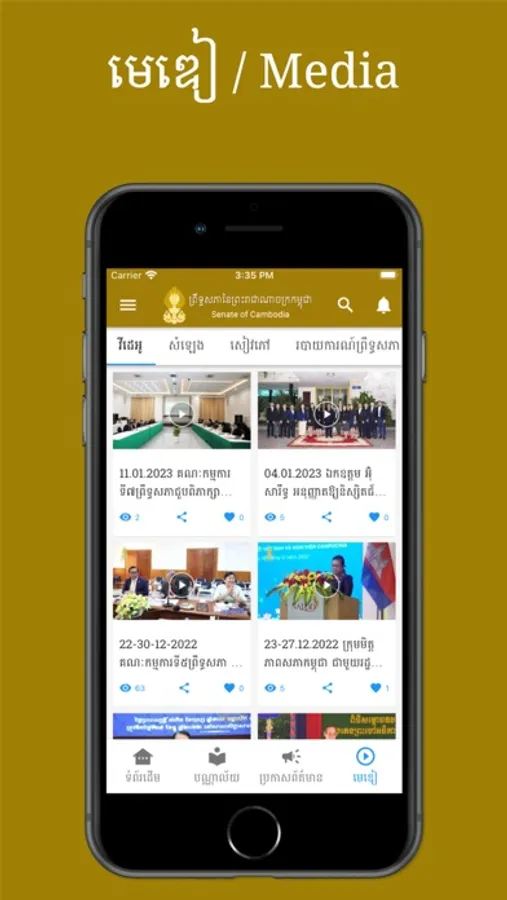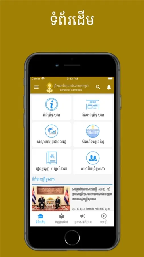 The Senate is the upper house of the Parliament of Cambodia. It is a legislative body composed of half of the members of the national assembly. The Senate seats are elected every six years by the commune councilors from 25 provinces of Cambodia and members of the National Assembly. In addition, the King nominates two senators, and the National Assembly nominates two. The Senate performs its duties as determined in the constitution and law in force. The Senate is chaired and presided by the president, currently, Samdach Vibol Sena Pheakdey Say Chhum of the Cambodian People's Party, and assisted by two Vice Presidents.