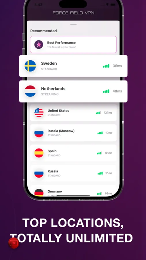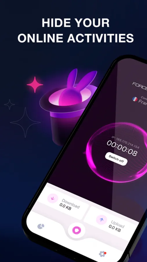 Complete end-to-end data encryption protects your device from hackers, malware, black ads, like a force field, that's why the VPN bears this name. Even your ISPs or special services cannot access your data such as your browsing history, messages or files.