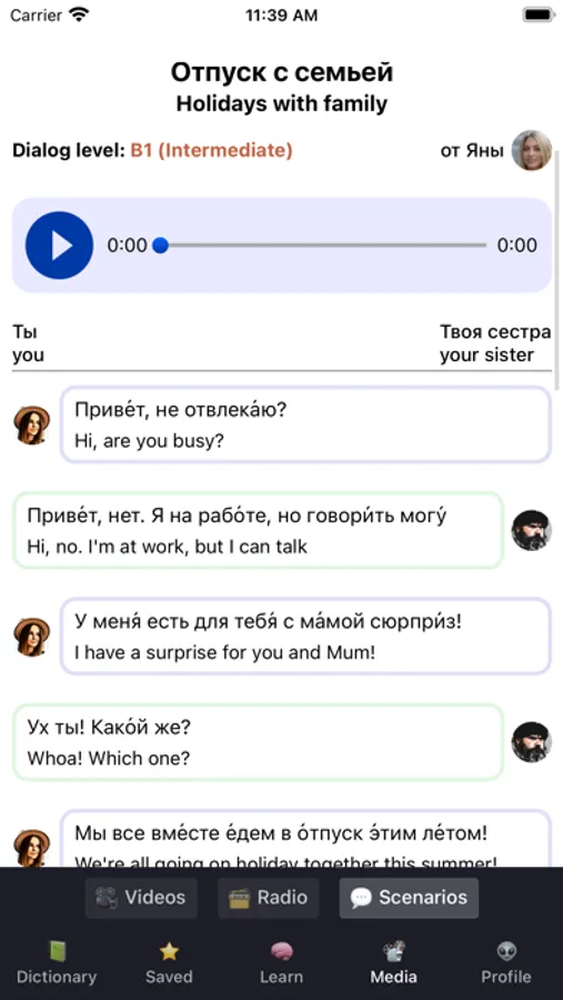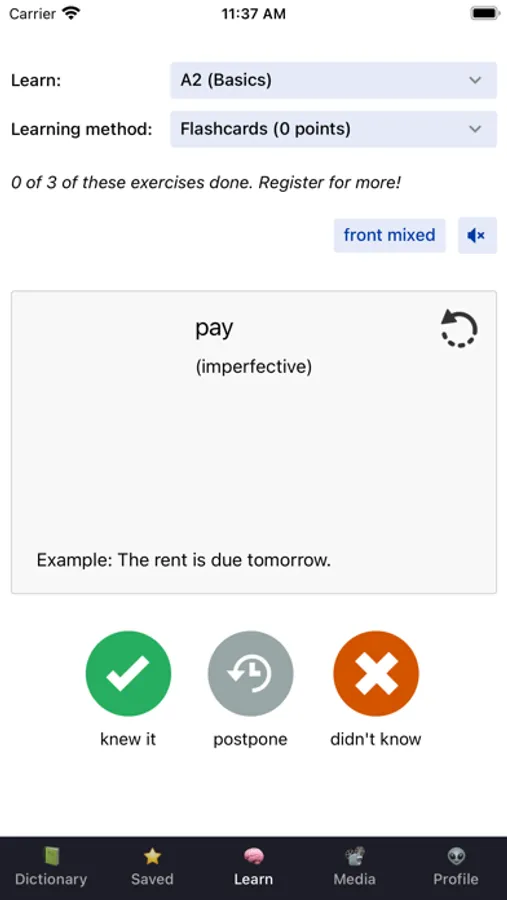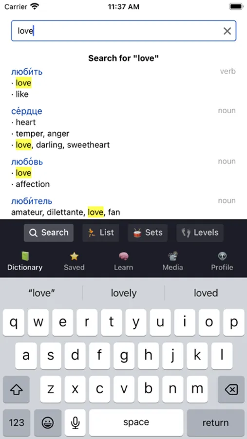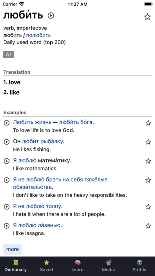 We have a learning section as well: You can "star" words and then learn them with flashcards, a sentence builder exercise, listening or writing exercise. Gather points to progress from A1 to C2 and perfect your Russian skills.