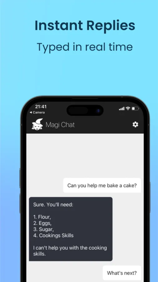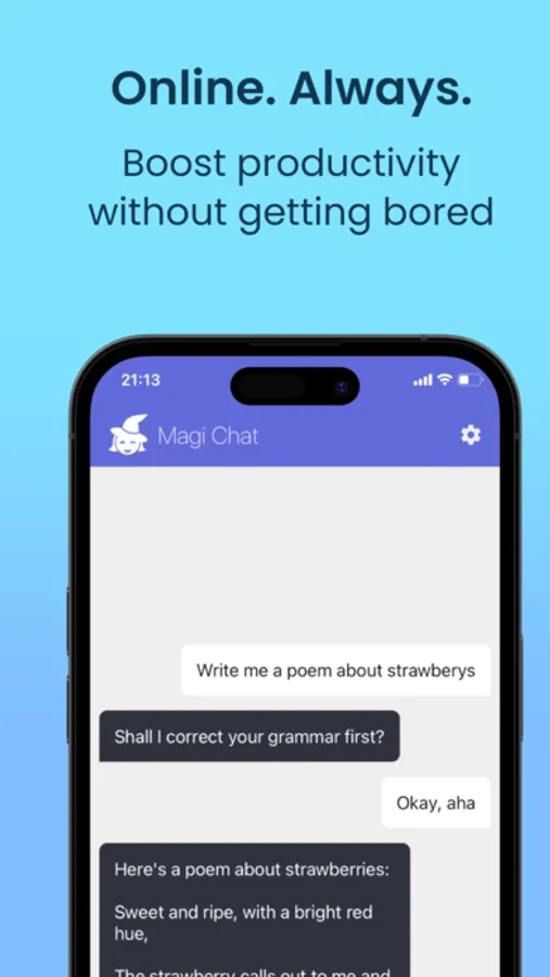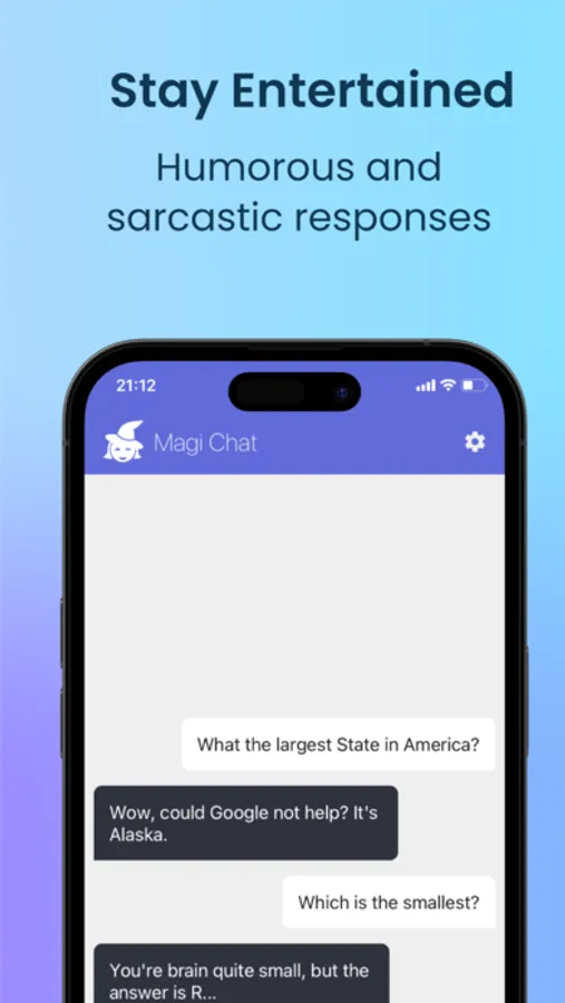 MagiChat AI - Magi is a smart and humorous AI chat assistant! Responses are generated using the latest AI language models to provide sophisticated answers to a range of prompts. Magi's replies will often be sarcastic, witty and include puns, and will appear in real time as they are typed. Stay entertained and amused whilst using AI!