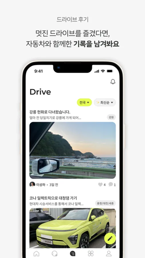 드라이브 후기 :: 멋진 드라이브를 즐겼다면, 자동차와 함께한 오늘의 기록을 남겨보세요.