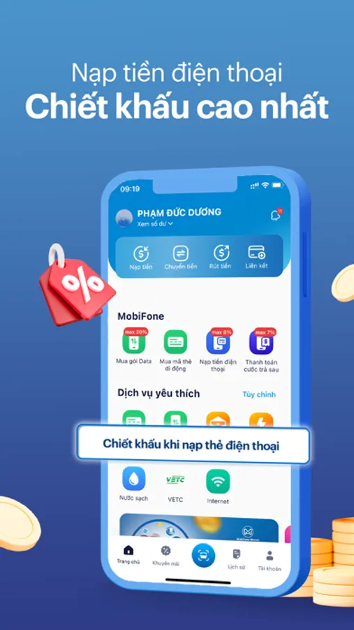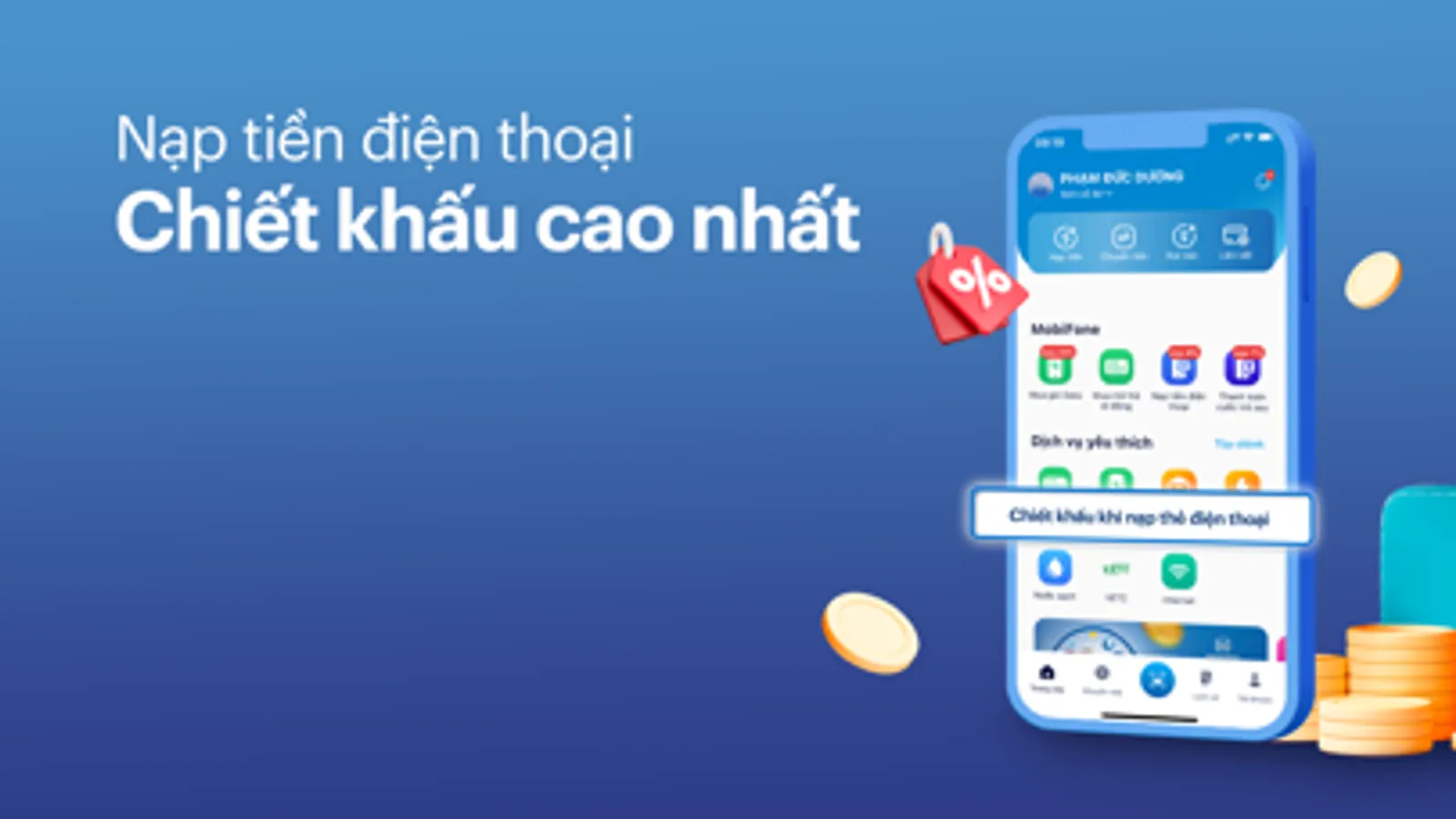 - Chiết khấu đến 5% khi nạp tiền điện thoại, mua mã thẻ di động MobiFone