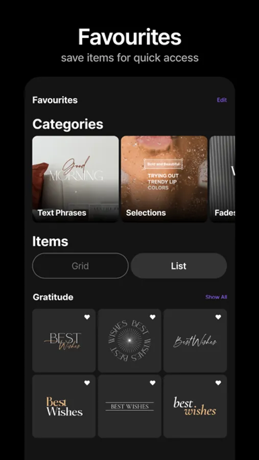 Found what you like? Save it to favorites to quickly access your stickers! Here you can save any element or even whole category you use on the regular. Reorder your favorite stickers in the sequence based on actuality.