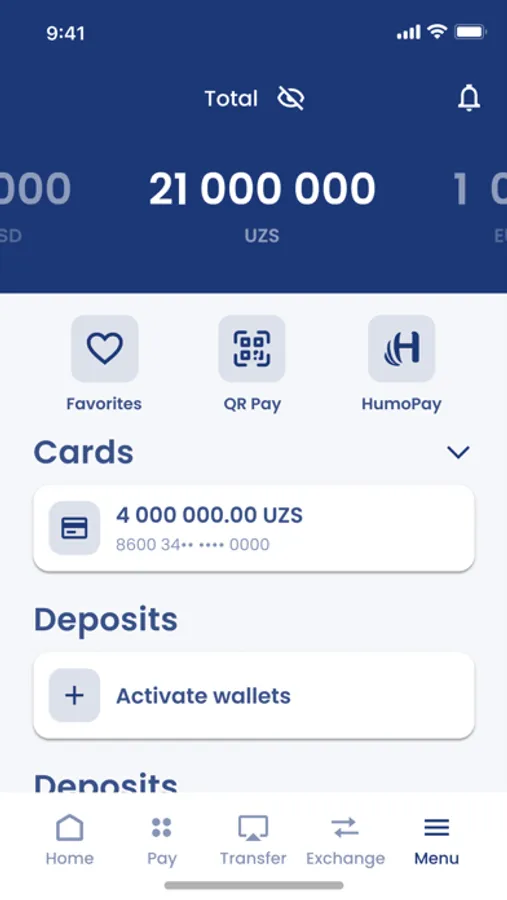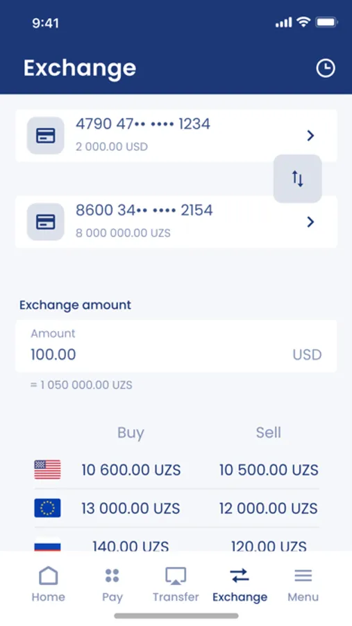 • make reverse conversion from FCY accounts; VISA, FCY demand deposit, and FCY wallet to UzCard, UZS demand deposit or wallet accounts;
