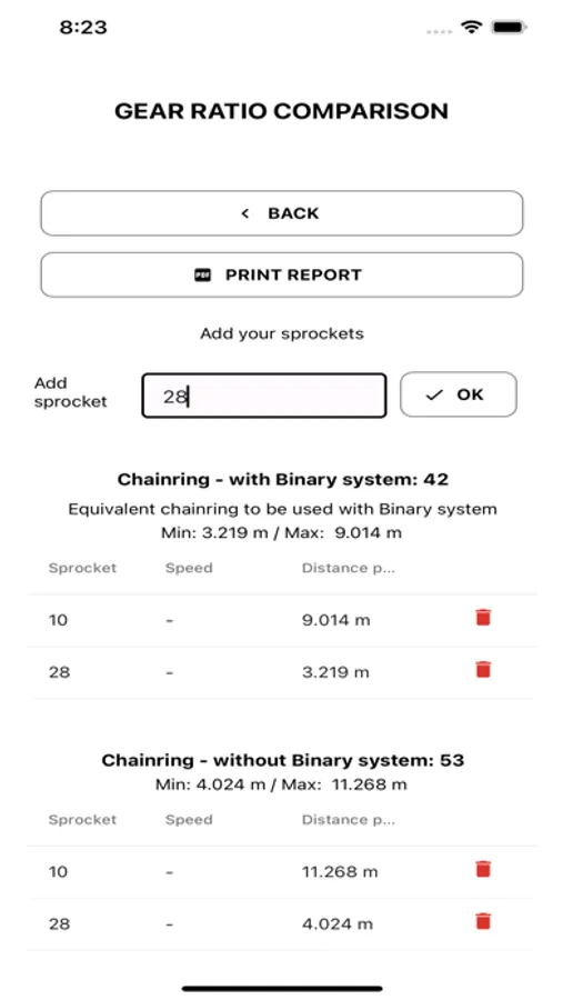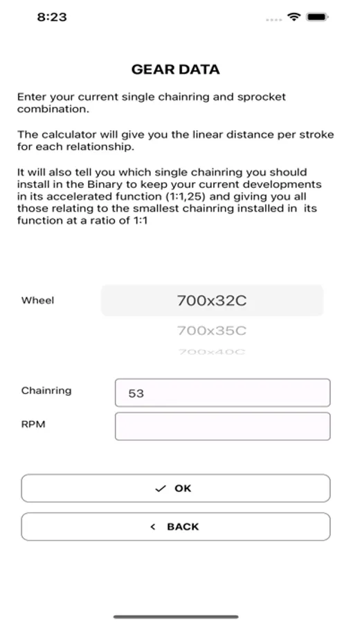 The app allows you to quickly and easily determine which types and sizes of optimal chainrings you should use on your bike fitted with the Binary Gear® system and the resulting metric ratio development, and compare it to the performance of a classic rear derailleur.