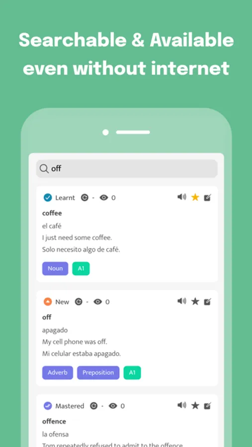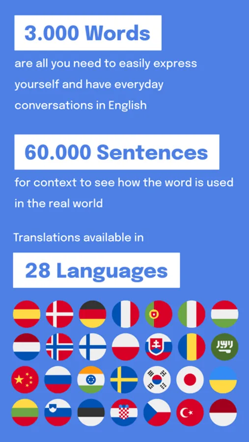 3000 words are all you need to easily express yourself and have everyday conversations in English, this app has all 3000, always available on your phone, even while offline.