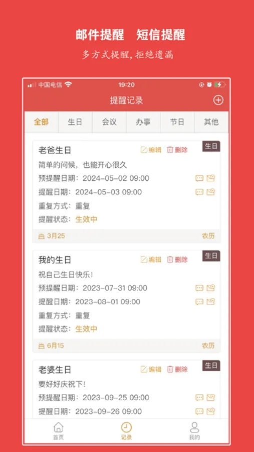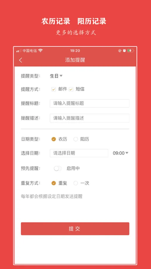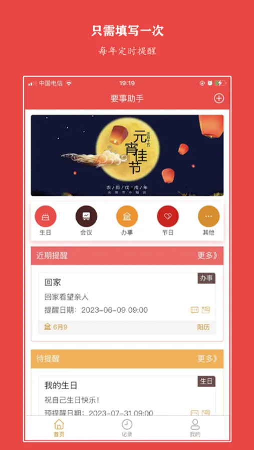 这款应用可以根据农历、阳历添加事件,到期自动提醒