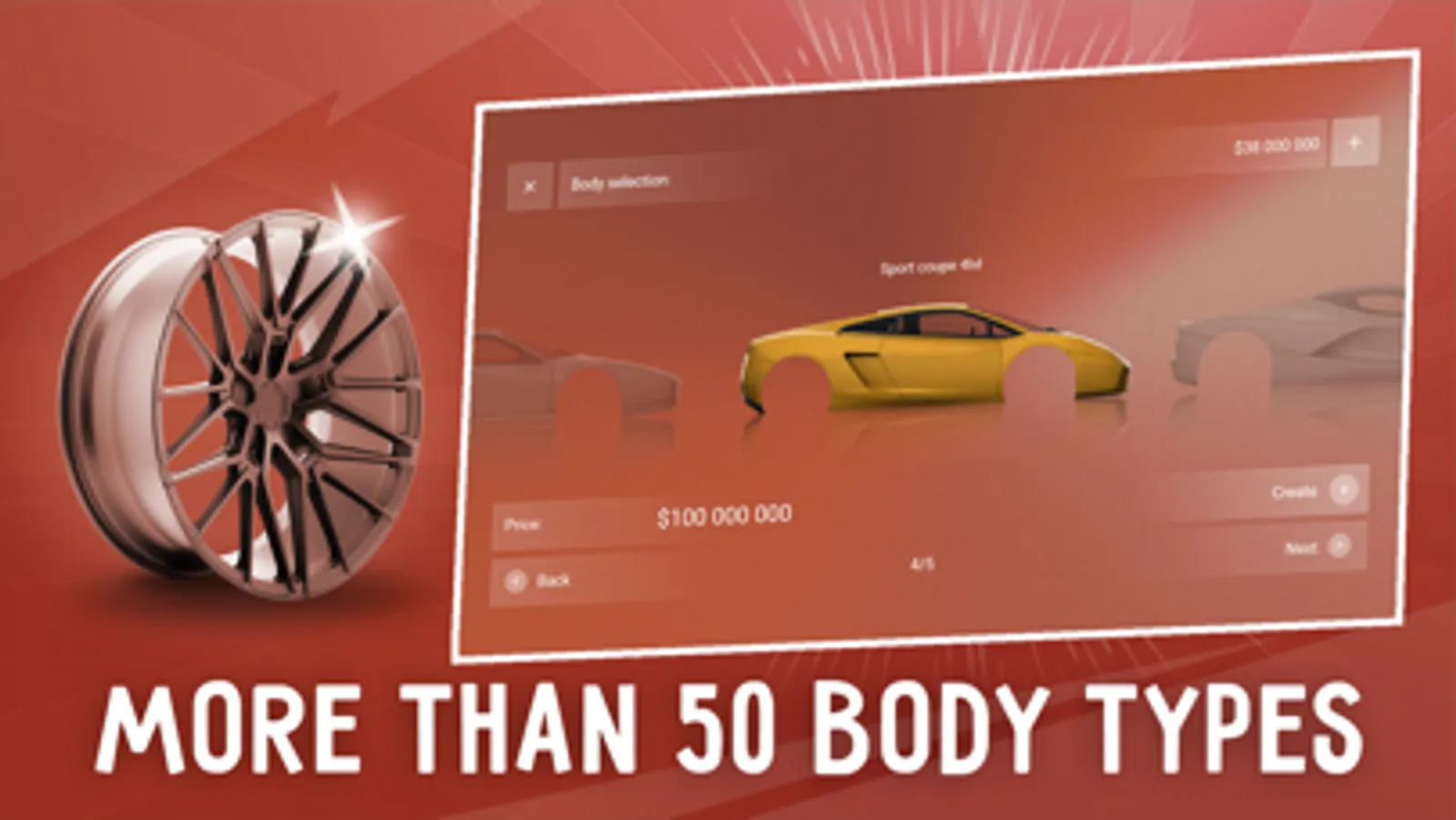 Create the car of your dreams: want a premium sedan? A sports coupe? A passable SUV? Or a family hatchback? Many common types of bodies with their settings are available for construction.