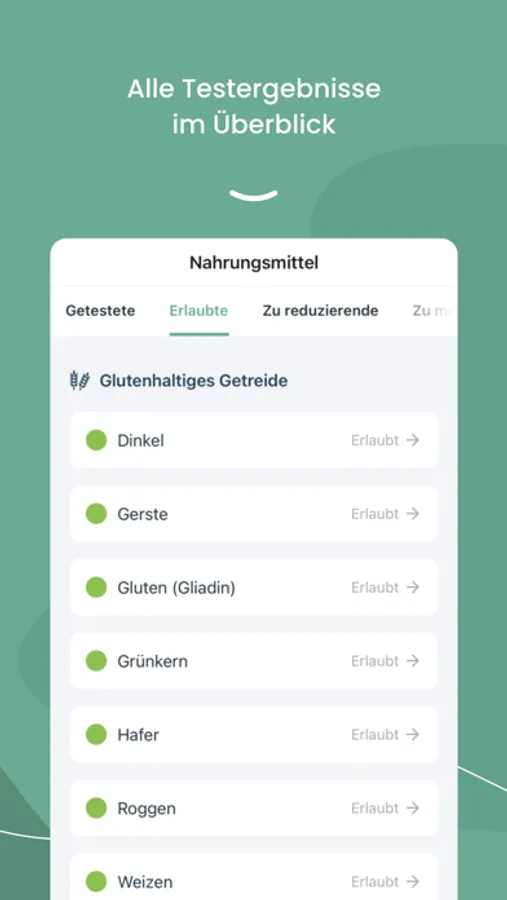 ► Auflistung aller im BIOBALANCE Test getesteten Lebensmittel mit Darstellung Deines persönlichen Testergebnisses für das jeweilige Lebensmittel.
