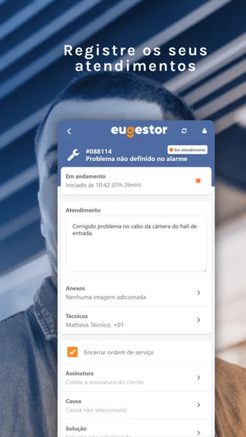 Com o aplicativo do EuGestor você pode gerenciar a suas ordens de serviço, ser notificado de novas OSs abertas, registrar atendimentos, tirar fotos das suas instalações e manutenções, coletar a assinatura do cliente e muito mais.