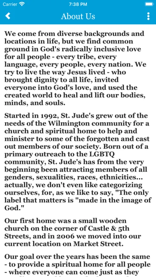 Started in 1992, St. Jude's grew out of the needs of the Wilmington community for a church and spiritual home to help and minister to some of the forgotten and cast-out members of our society. Born out of a primary outreach to the LGBTQ community, St. Jude's has from the very beginning been attracting members of all genders, sexualities, races, and ethnicities... actually, we don't even like categorizing ourselves, for, as we like to say, "The only label that matters is "made in the image of God."