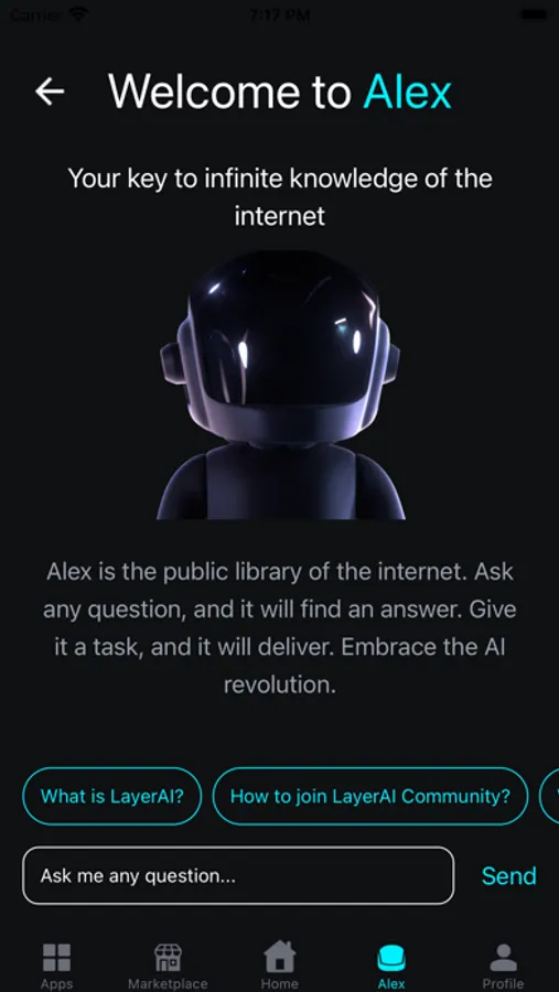 Now introducing Alex - the public library of the internet. Ask any question, and it will find an answer. Give it a task, and it will deliver. Embrace the AI revolution.