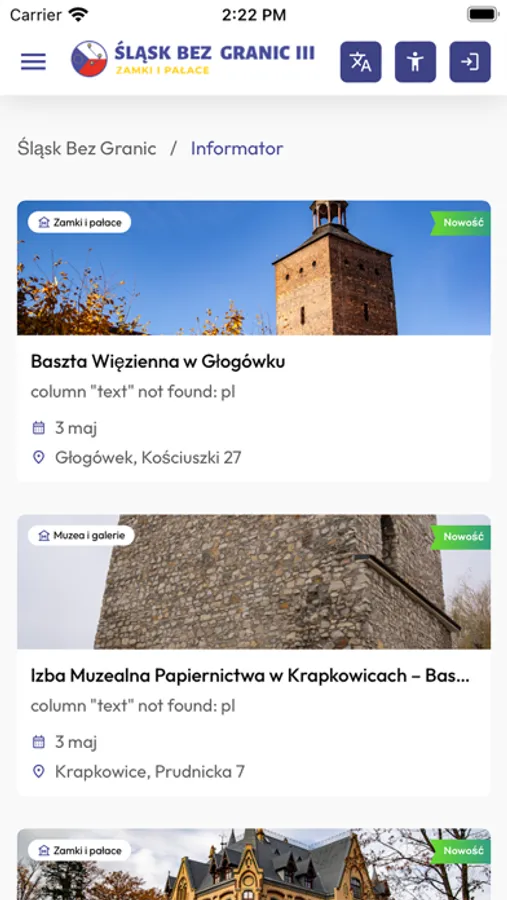 Śląsk bez granic to aplikacja turystyczna skupiający się na zamkach i pałacach znajdujących się na terenie Śląska. Aplikacja oferuje bogatą bazę informacji na temat tych zabytków, zawierającą opisy, zdjęcia, historie i ciekawostki. Można tu znaleźć informacje na temat godzin otwarcia a także organizowanych w zamkach i pałacach wydarzeń kulturalnych i edukacyjnych. Aplikacja Śląsk bez granic umożliwia również przeglądanie mapy regionu, na której znajdują się zaznaczone wszystkie zamki i pałace, co ułatwia planowanie zwiedzania. W ramach portalu działa również społeczność, skupiająca miłośników historii i architektury, którzy dzielą się swoimi doświadczeniami i poradami związanymi z wizytą w zamkach i pałacach na Śląsku