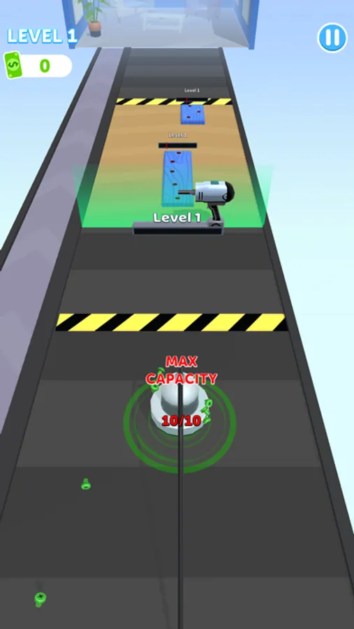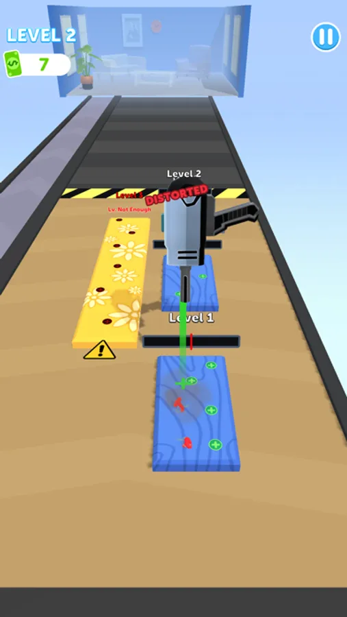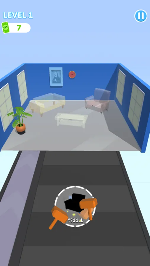 Collect metal parts with the magnetic crane, power up the nail gun and design the room by hammering nails into the planks!